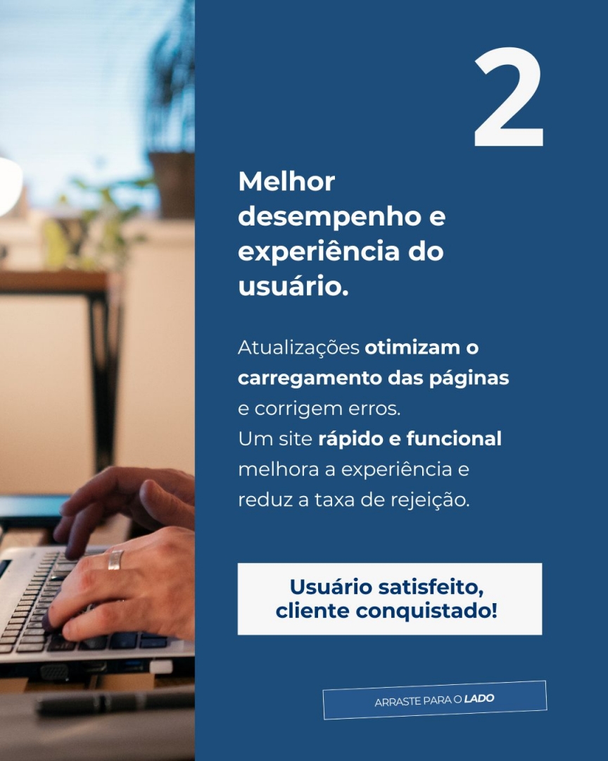 Atualizações otimizam o carregamento das páginas e corrigem erros. Um site rápido e funcional melhora a experiência e reduz a taxa de rejeição.