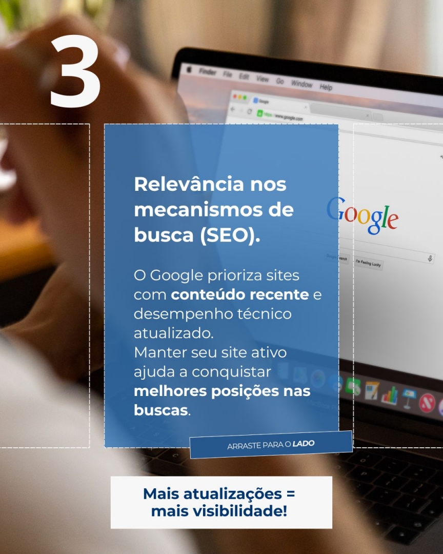 O Google prioriza sites com conteúdo recente e desempenho técnico atualizado. Manter seu site ativo ajuda a conquistar melhores posições nas buscas.